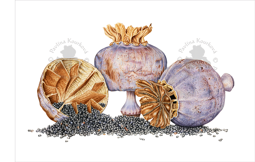 Makovice, ve kterých dozrála semínka, se otevírají – každé zrníčko nese nový potenciál a možnost života, připraveno pokračovat v růstu, kvetení a zrání. Obraz zachycuje okamžik, kdy makovice dozrály a sdílejí, dávají své "plody" dál....